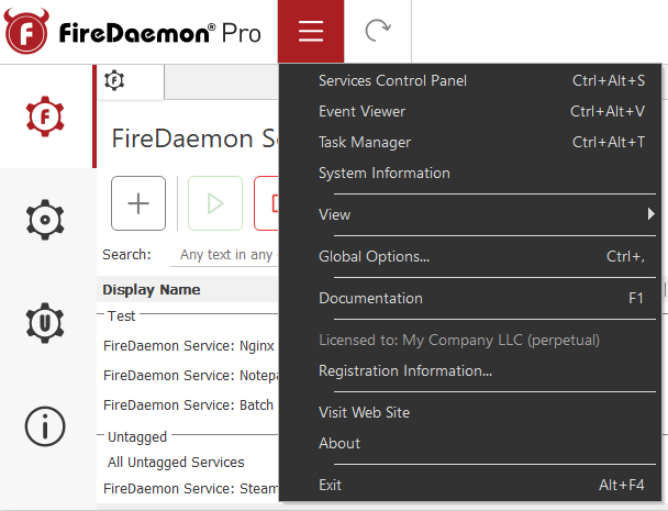 | Documentation | Opens the FireDaemon Pro documentation at the following address: https://firedaemon.com/documentation/firedaemon-pro/. Also accessible by clicking F1. |